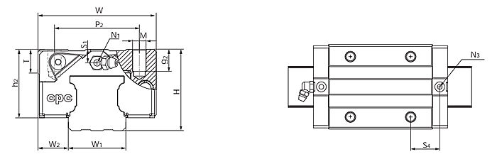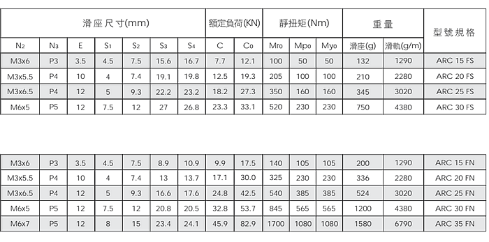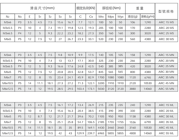 CPC標準型滾珠直線導軌ARC系列采用O型排列四列式滾珠循環設計,滾珠軌道面與滾珠接觸角為45度,可達到四方向等負荷之效果。CPC特別在設計上加強力臂Lo的長度,故在承受相同外力F時,有更高的Mr值以提高剛性及抗扭矩能力方面之表現。此外同機型滑座中選用較大尺寸的鋼珠及較多鋼珠數,在負荷能力的表現上更是多出競爭對手10%~30%充分展現高負荷、高扭矩、高剛性功能。